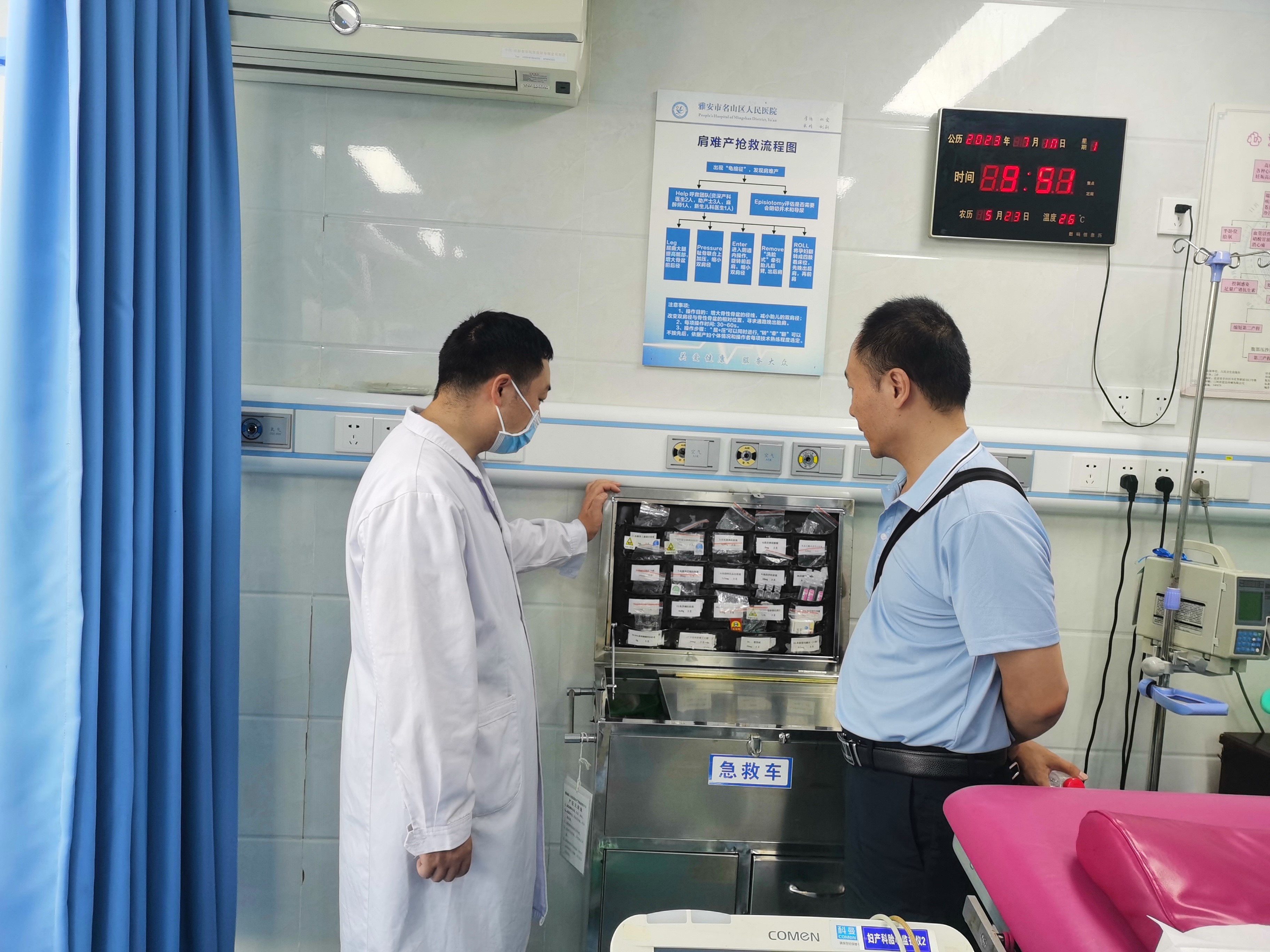 专家组一行首先到产房,以模拟羊水栓塞产妇救治,突击检查产科、儿科危重孕产妇、新生儿识别能力和麻醉科、儿科、重症医学科等多学科联合救治能力。