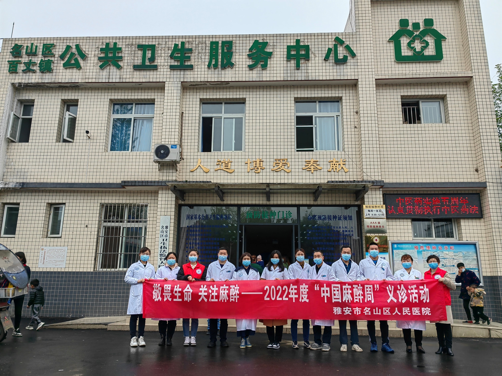 2022年4月1日,名山区人民医院、百丈镇中心卫生院联合开展了2022年度中国麻醉周义诊活动,活动主题是“敬畏生命,关注麻醉”,成都医学院第一附属专家董蜀华、郭利明、李菊、伍松及雅安市人民医院及雅安市中医医院数名专家参加。为落实疫情防控措施,防止人员聚集风险,此次活动在百丈镇中心卫生院室外广场进行,为群众免费测血压60余次、测血糖60余次,发放宣传资料100余份。