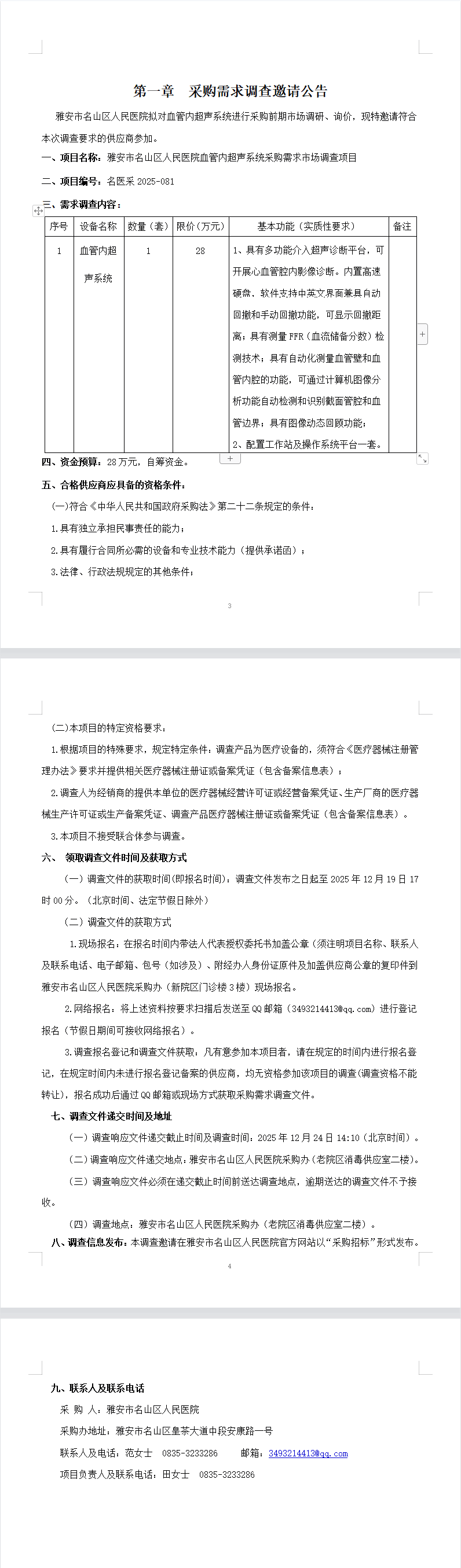 雅安市名山区人民医院血管内超声系统采购需求市场调查公告